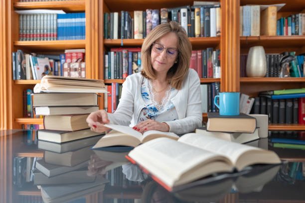 Senior white woman reading a book on a glass table with a bookcase full of book behind her