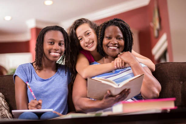 Multi-ethnic family members at home reading books or studying together. African descent single mother helps children with homework. One child is adopted.