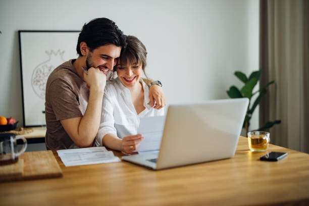 Happy boyfriend embracing his girlfriend while doing home finances together online on a laptop computer in the kitchen.