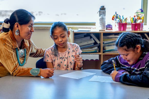 Young Female Indigenous Navajo Teacher Assisting Elementary Age Students in Class Room at an Elementary School in Monument Valley Utah